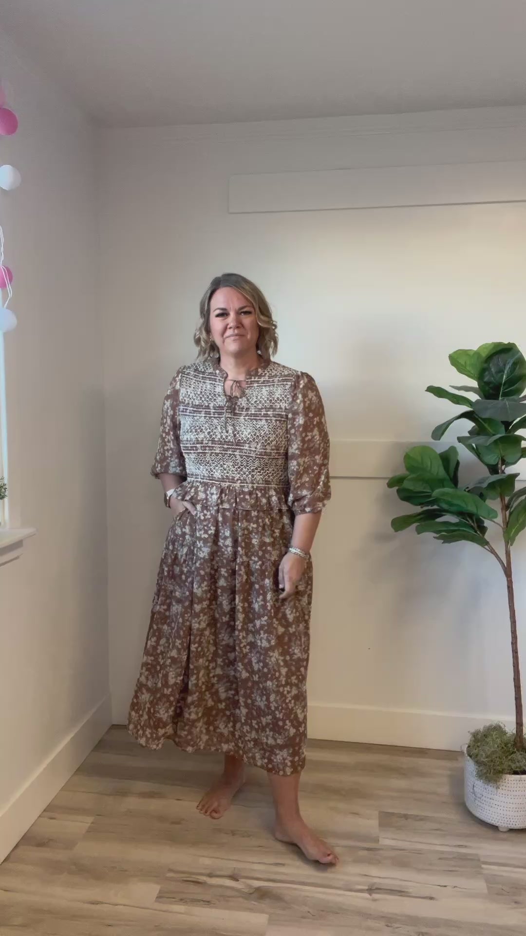 The Tasha Maxi blends delicate florals with sophisticated design, featuring a light brown base and ivory smocking on the bodice that adds pattern and texture. Its sheer floral printed overlay flows gracefully over a lined skirt, while a ruffle at the waist highlights your silhouette. With 3/4 sleeves and two elegant ties at the neck, this dress offers a unique, neutral palette that’s anything but boring—perfect for those who want to stand out with refined details and effortless charm.