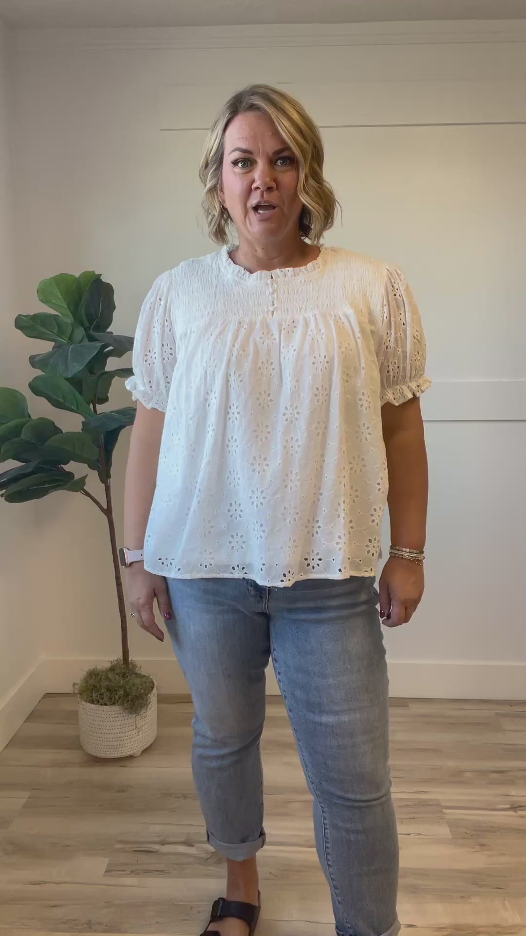 The Tilly Eyelet Top is a playful twist on a classic blouse with its delicate eyelet fabric and charming puff sleeves. Featuring a half button-up front and a sweet ruffle collar and cuffs, this top adds fun details to your look. Fully lined for comfort and designed with a stylish yoke, it’s perfect for sunny days when you want to feel light and lively.