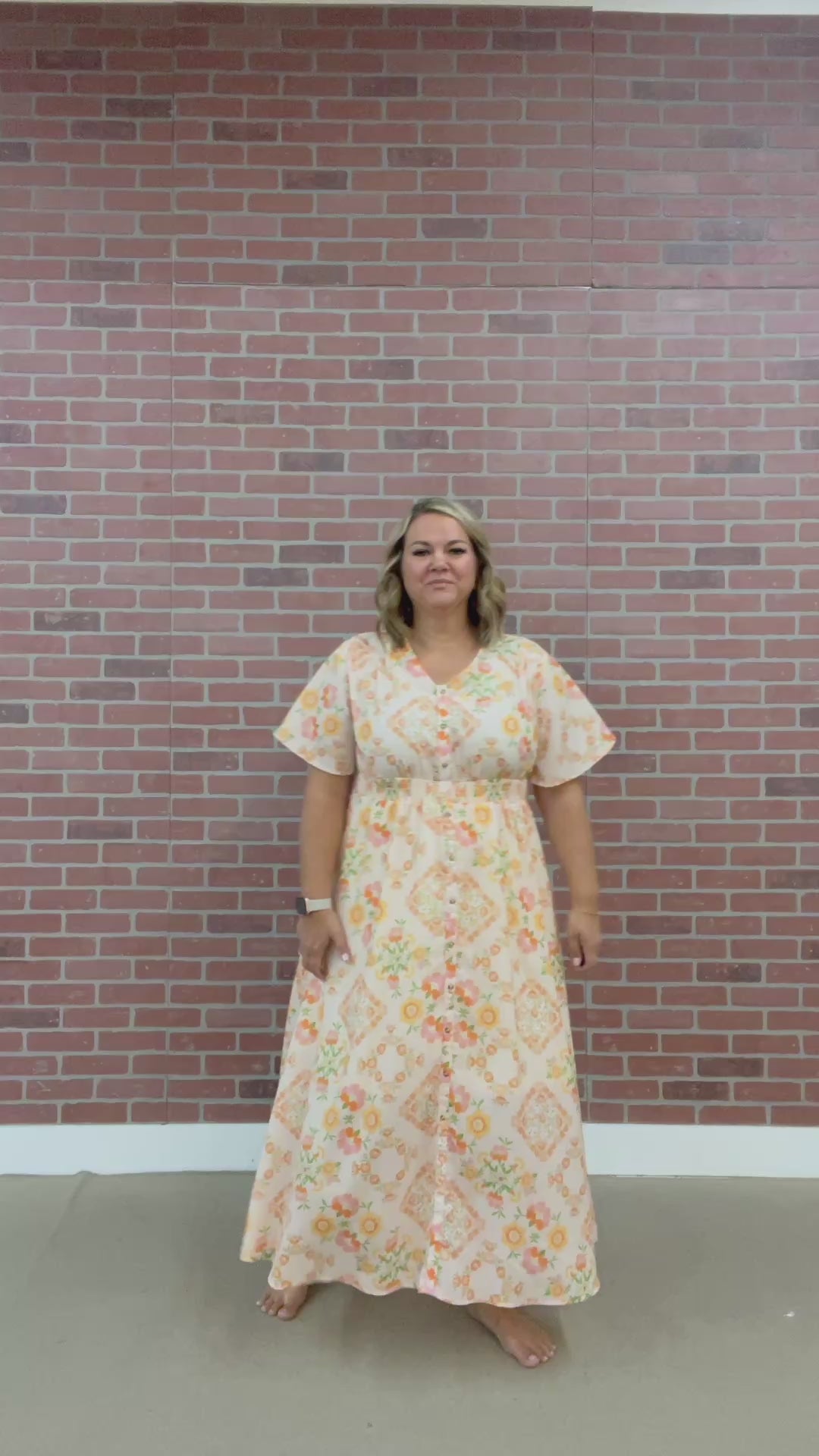 The Violet Maxi is a playful and feminine addition to your wardrobe. Its peach color, adorned with orange and pink florals, will add a cheerful touch to any day. The short flutter sleeves and lightweight fabric give a breezy feel, perfect for any occasion. The wide elastic waist and V-neck provide a comfortable fit, while the button-up front adds a vintage vibe. And don't worry about any wardrobe malfunctions, as the bottom buttons are sewn closed for security. With a lined skirt and subtle gathering under the yoke, this dress is as functional as it is stylish.