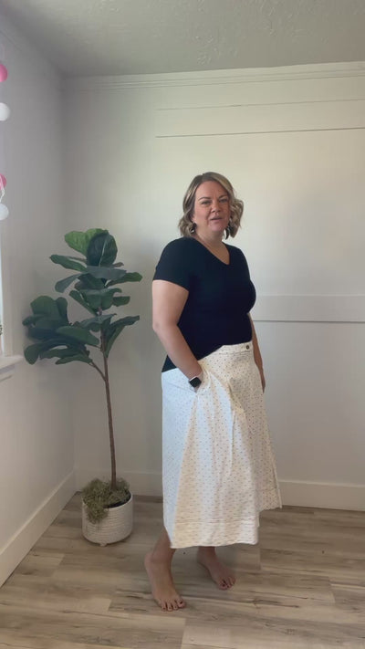 The Willa Midi Skirt brings effortless charm to your everyday rotation. Crafted in crisp white denim, this A-line beauty features playful black polka dots that add personality to any outfit. Practical deep front pockets keep your essentials close while you move through your day. Perfect for pairing with sneakers, sandals, or boots—this versatile skirt transitions seamlessly from casual weekends to dressed-up occasions.